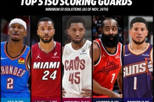 五人分别是:1、亚历山大(每个单打回合得分 1.28分);2、鲍威尔 1.25分;3、米切尔 1.24分;4、哈登 1.12分;5、布克 1.11分。
